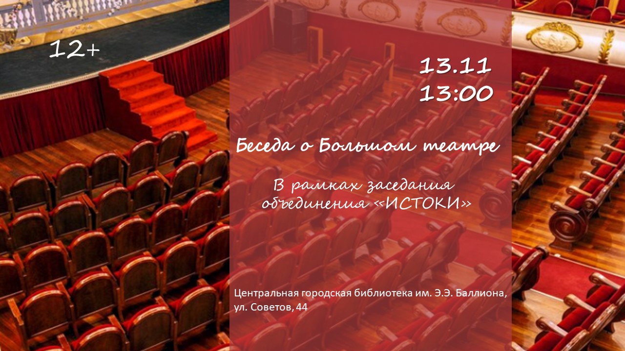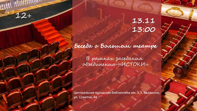 Участники объединения старожилов и хранителей истории «Истоки» свою очередную встречу посвятят Большому театру. Во время мероприятия собравшиеся вспомнят историю театра и знаменитых актеров, блиставших на его сцене в разные эпохи.