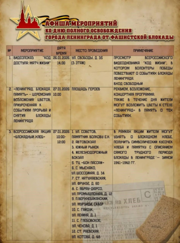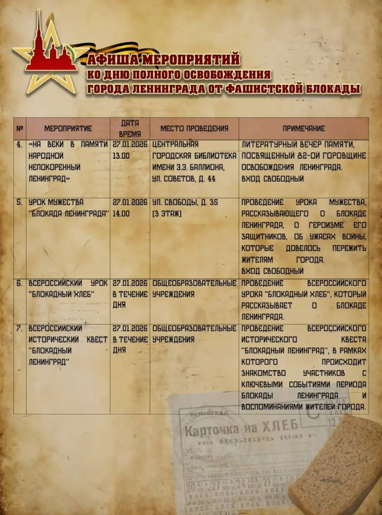 В 14:00 в Молодежном центре (ул. Свободы, 35, 3 этаж) состоится урок мужества, рассказывающий о блокаде Ленинграда, героизме его защитников и ужасах войны, с которыми столкнулись жители.