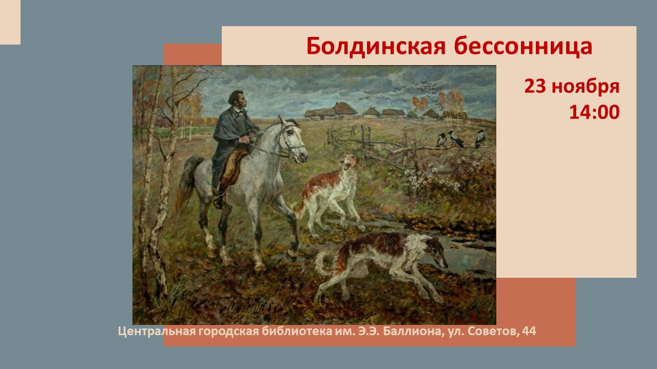 23 ноября в конференц-зале Центральной городской библиотеки им. Э. Э. Баллиона в 14.00 состоится мероприятие "Болдинская бессонница".