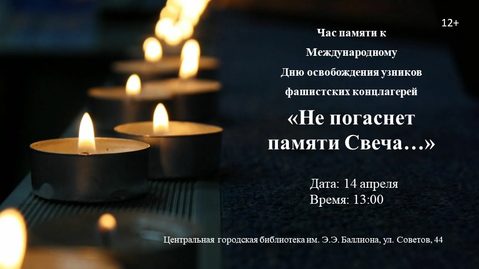 Невозможно простыми словами описать их страдания! Поэтому в Баллионовской библиотеке пройдёт час памяти к Международному Дню освобождения узников фашистских концлагерей под названием «Не погаснет памяти Свеча».