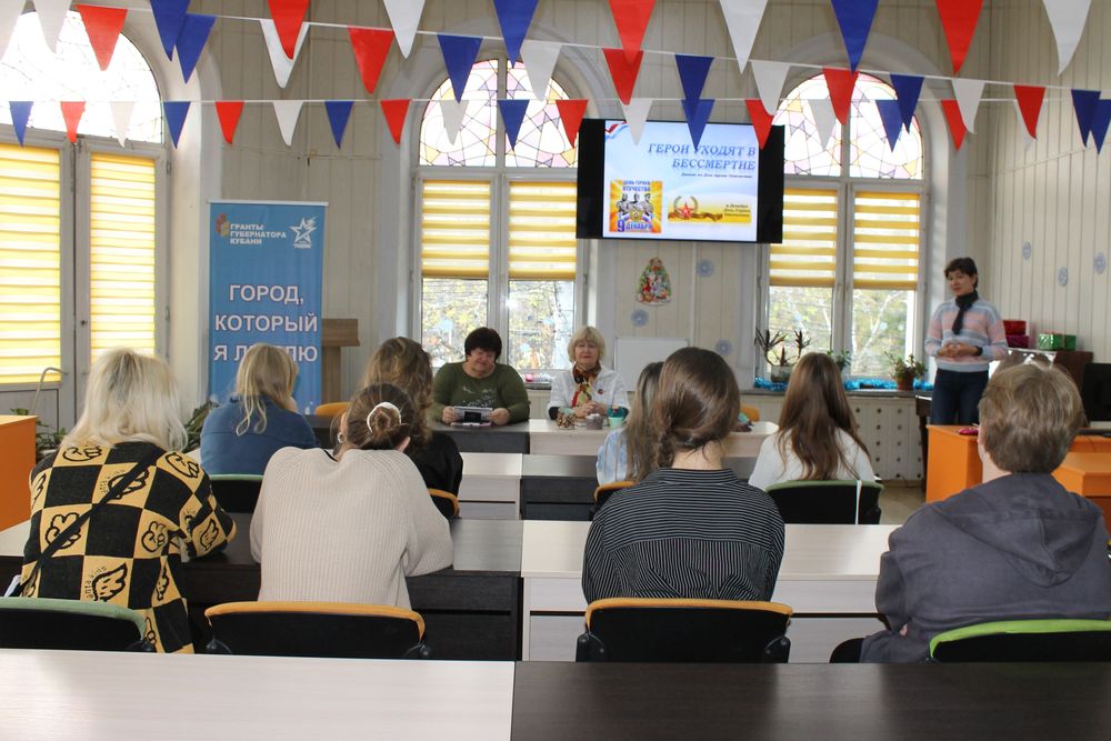 Мероприятие началось с доклада заведующей массовым отделом о выдающихся героях нашего государства из разных исторических периодов, а также традициях празднования этой даты. Далее слово перешло к руководителю объединения старожилов и хранителей истории «ИСТОКИ» Алевтине Юрьевне Коноваловой, которая прочла авторские патриотические стихотворения о солдатах, а также подробно рассказала о героях в своей семье. Продолжилось мероприятие выступлением руководителя Новороссийского отделения Союза пенсионеров России Татьяны Владимировны Севастьяновой, которая сообщила присутствующим о деятельности СПР в поддержку бойцов Специальной Военной Операции. Так студенты узнали о том, как изготовить окопную свечу, как правильно плести маскировочную сеть и о письмах со словами поддержки, которые отправляют неравнодушные участники СПР на фронт. После Татьяна Владимировна прочла собравшимся авторские стихотворения о Новороссийске и о силе духа, и мужестве наших воинов. Затем слово было передано гостье – Людмиле Тимофеевой. Были прочитаны стихотворения «Безымянному солдату» и «В жизни главное жить без страха»