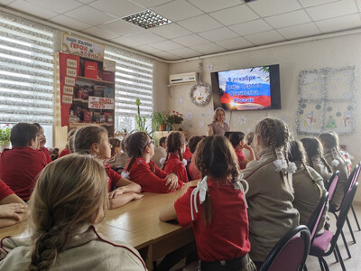 Ведущая рассказала учащимся о героических страницах истории нашего Отечества, о славных ратных традициях наших вооруженных сил, о том, что дата 9 декабря приурочена к учреждению ордена Святого Георгия, который был введён во времена правления императрицы Екатерины II. Звание Героя Российской Федерации – главная награда страны, она присвоена большому числу наших сограждан. Эту почётную награду получали воины, проявившие в боях особую смелость, мужество и отвагу.