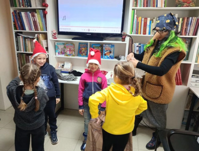 После знакомство с фондом библиотеки детей встретили сказочные персонажи в новогоднем утреннике «В гостях у зимней сказки». Ведущая с помощью слайдом загадала ребятам каверзные вопросы по зимним сказкам «Двенадцать месяцев» и «Мороз Иванович», ответить ребятам было не так уж просто, но с помощью подсказок дети справились с заданиями. Ребята в гости ждали Снегурочку, но вдруг на праздник прилетела Баба Яга. Она решила испытать наших друзей и вместе с ведущей провела с мальчишками и девчонками увлекательные конкурсы: «Кто лучше справится с новогодней сосулькой?», «Наряди своего снеговика» и «Кому достанется волшебное яблоко?». Это было очень подвижно и весело, дети с радостью участвовали и поддерживали друг друга. Каждый участник мероприятия окунулся по-настоящему в волшебную сказочную атмосферу и получил массу приятных предпраздничных впечатлений.