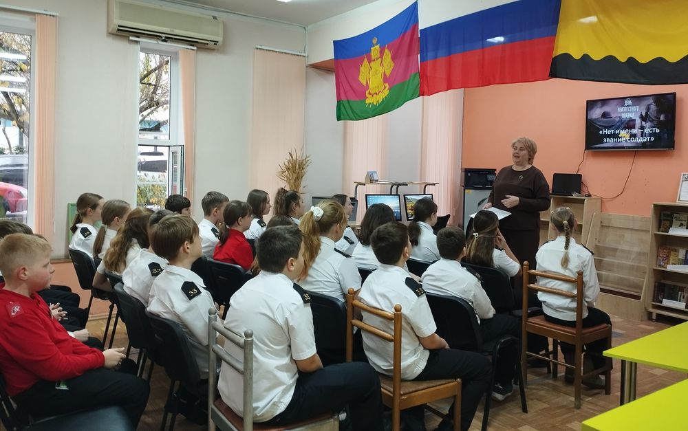 В ходе беседы библиотекари рассказали ребятам об истории создания мемориального ансамбля «Могила Неизвестного Солдата» у Кремлевской стены. Школьники узнали о великом подвиге безымянных защитников Отечества, сложивших головы в боях за Родину. Особый акцент был сделан на том, что память о них хранят не только в столице, но и в Краснодарском крае, где также установлены мемориалы и памятники неизвестным воинам.