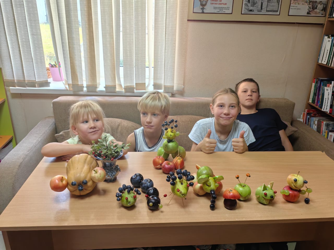 Мероприятие началось с загадок, благодаря которым, дети угадали тему встречи. Библиотекарь рассказала о пользе витаминов, которые содержатся во фруктах. Познакомила с разными видами подачи их на стол. Подробнее остановились на фруктовых композициях. Основным и долгожданным этапом была практическая часть: участники старательно нарезали фрукты и создавали знакомые, но в то же время причудливые фигуры из яблок, груш, слив, винограда и даже тыквы.