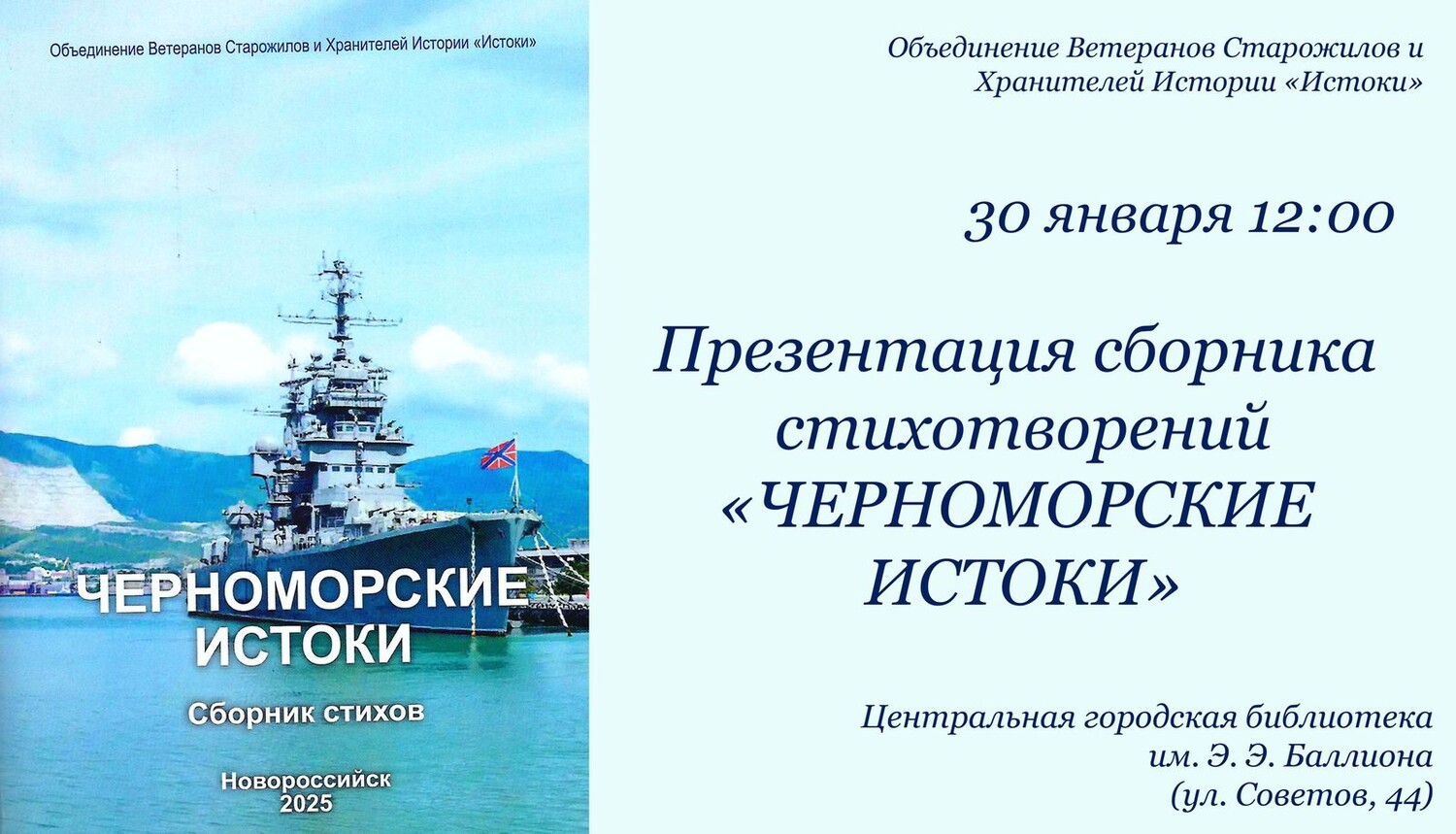 Приглашаем вас посетить торжественную презентацию нового поэтического сборника объединения старожилов и хранителей истории города Новороссийска «ИСТОКИ» под названием «Черноморские истоки».