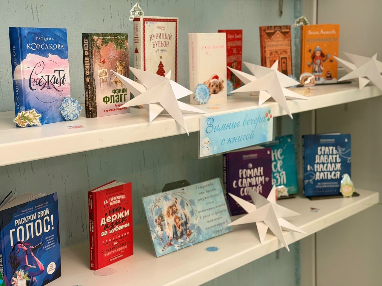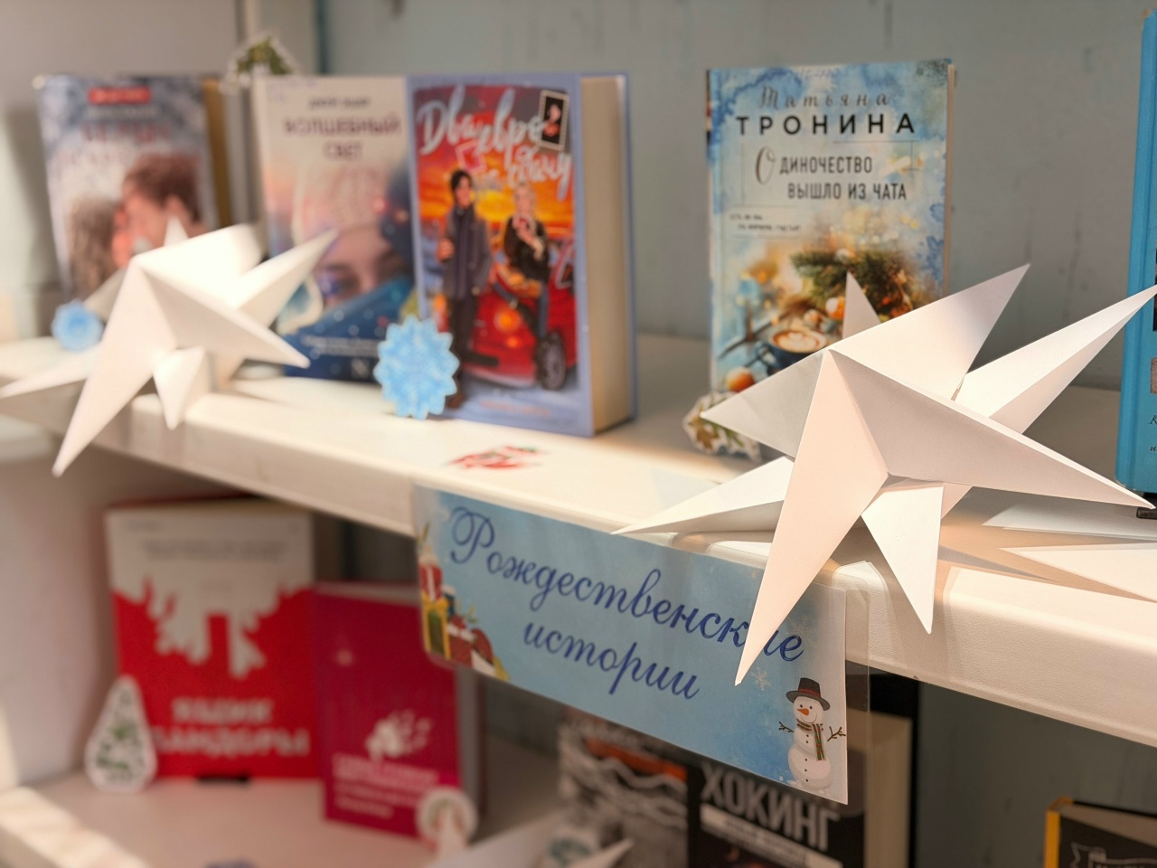 Вас ждут не просто полки с книгами. Это целый портал в зимнюю сказку, приглашающий каждого гостя на свой уникальный праздник. Под мягким светом холла переливаются золотые и алые обложки, словно гирлянды, зажжённые для вдумчивого читателя. Здесь живёт магия жанров: захватывающие романы с интересными сюжетами томятся рядом с остросюжетными детективами. Повести в нарядных обложках соседствуют с полезными книгами психологического жанра и научно-популярной литературой. И всё это, чтобы читатели нашли вдохновение и встретили праздники с отличным настроением и новыми знаниями.