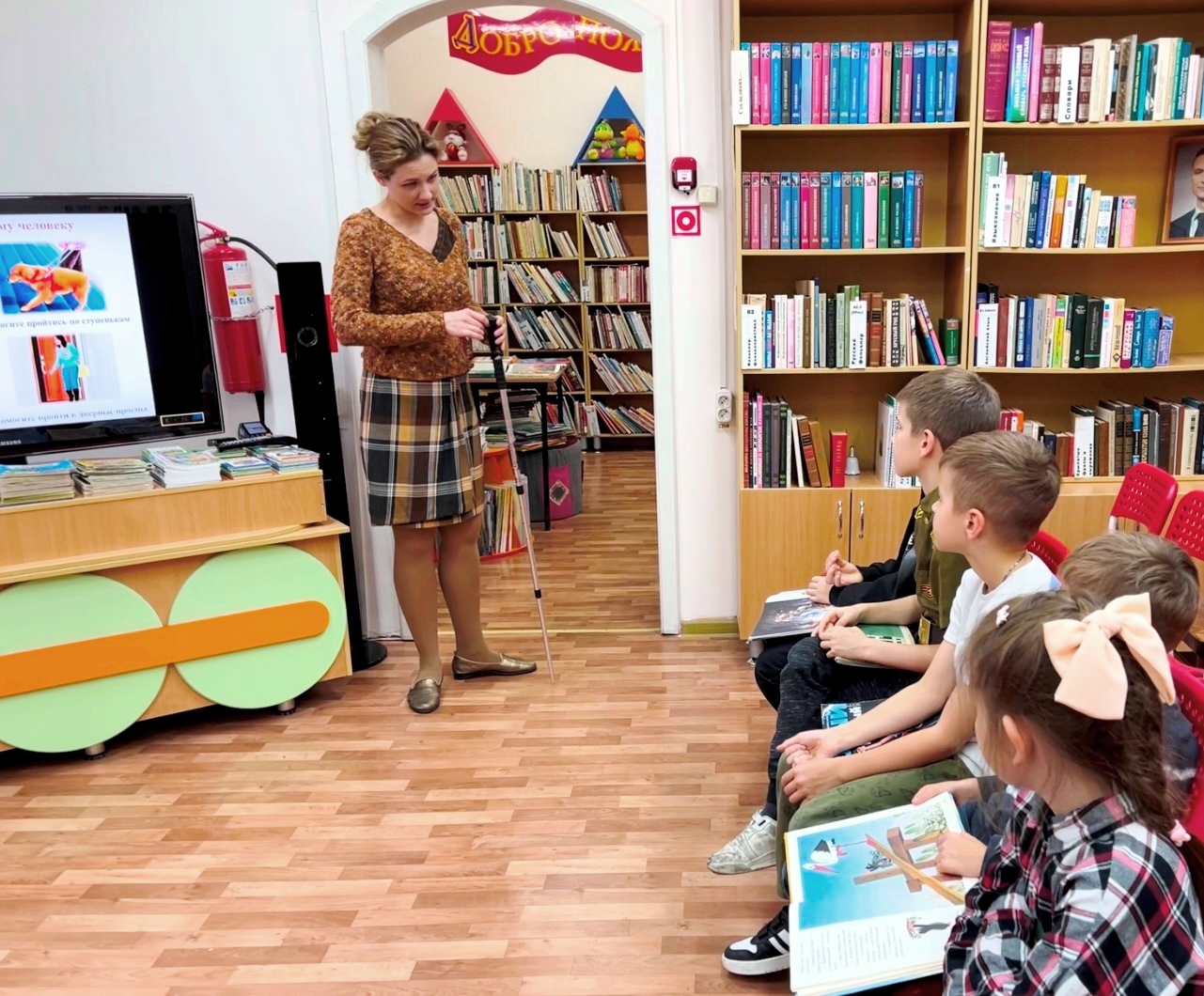 Далее библиотекари поговорили с мальчиками и девочками о том, как правильно вести себя со слепым или незрячим, о помощи, которую может оказать каждый, встретившись с человеком с белой тростью.