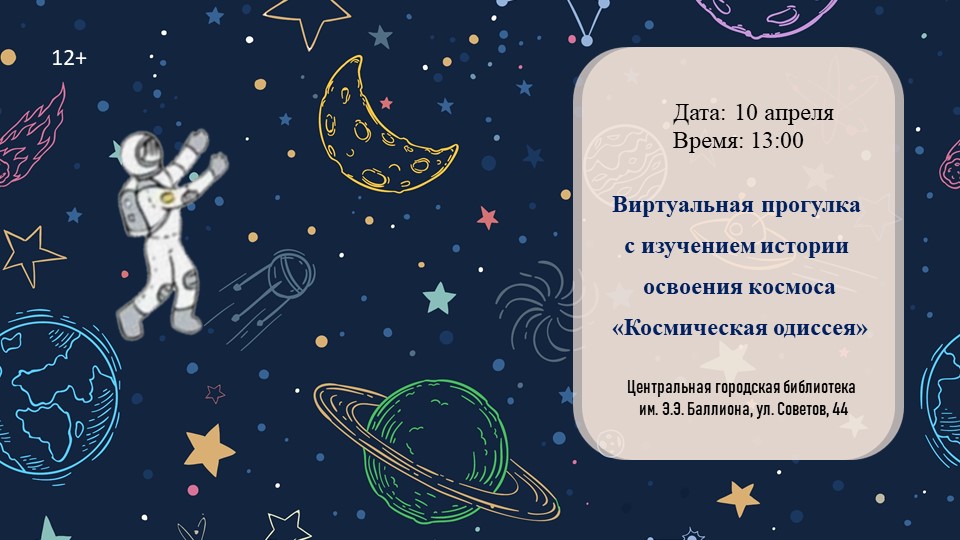 Участники объединения старожилов и хранителей истории «ИСТОКИ» соберутся в большом читальном зале Центральной городской библиотеки им. Э.Э. Баллиона, чтобы посвятить время чтениям авторских стихотворений о планете и отважных покорителях звездного пространства. Мероприятие приурочено к знаменательной дате — 65-й годовщине со Дня освоения космоса.